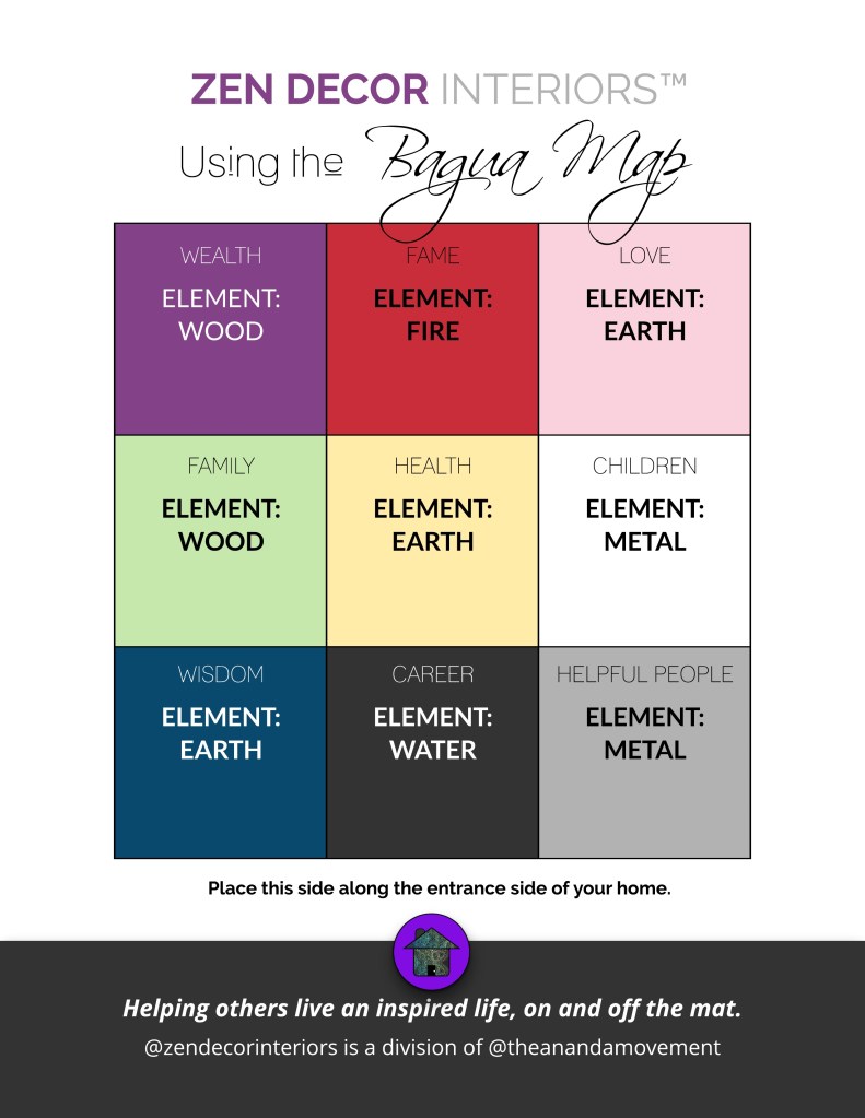 Feng Shui principles coincide with the 5 earth elements: Earth, Water, Fire, Metal and Wood. Each element has unique energetic properties that help attract certain outcomes. Therefore, the Bagua Map is used to determine how you can balance the energy in your home for optimal results.
